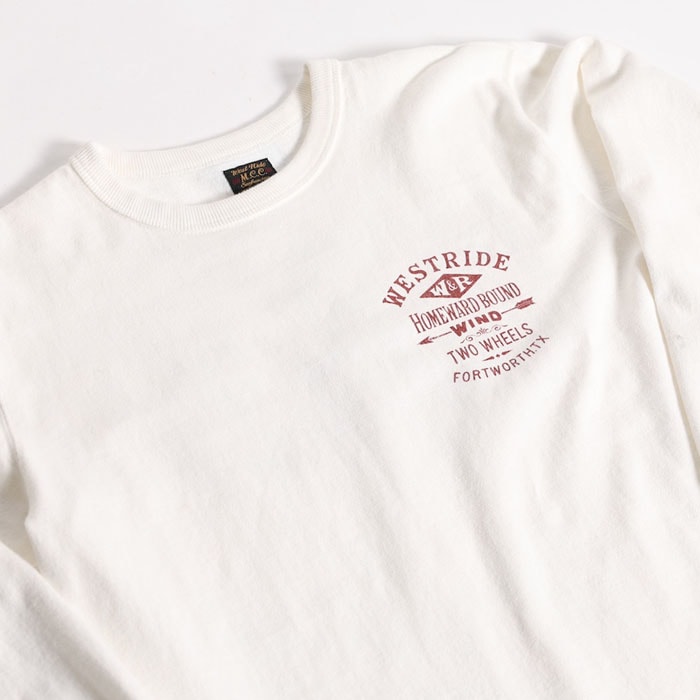 縫製:WESTRIDEのオリジナルL/S TEEは、丸胴の吊り機で編み立てる→サイドを割ってダブルシームで縫製→内側サイドの縫い代をカット→ネックはトリプルバインダー。と非常に手間のかかる仕上げとなっている。この工程により、丸胴に見られるヨジレなどの型崩れもなく、肌触りも良好となる。製品としての安定した品質を実現している。8番の単糸ではなく、16番双糸を使用することで生地に取り込むことのできる空気の層を増し、着用感をより高いものにしている。肌着としての側面も持つTEE類だけに、プリント柄だけでなく、品質そのものに拘って生産しています。