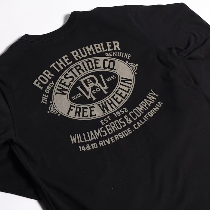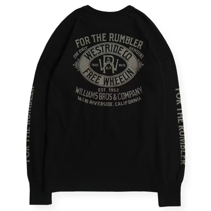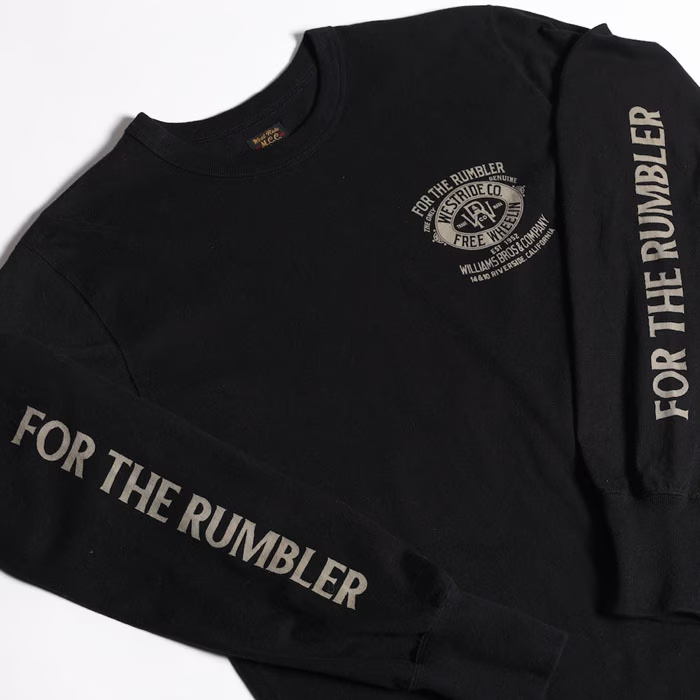 旧くは「4輪の馬車=音を立てて前に進むもの」を意味するRUMBLERSのワード。そんな人々の為の当時の衣料メーカーの旧き良きアドバタイズ風イメージでまとめ上げた今季の新作メイングラフィック。WILLIAMS BROSの名前でシーズンテーマに繋がる「JAMBALAYA」のカントリー・シンガーと自由への「解放」を表現。レイヤードで映える袖プリント入り。