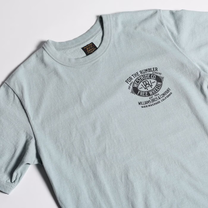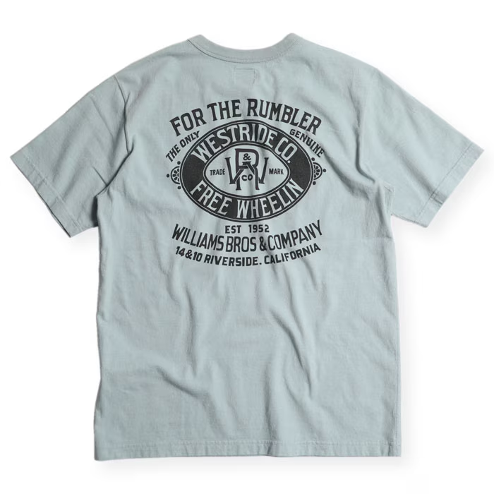 縫製:WESTRIDEのオリジナルTEEは、丸胴の吊り機で編み立てる→サイドを割ってダブルシームで縫製→内側サイドの縫い代をカット→ネックはトリプルバインダー。と非常に手間のかかる仕上げとなっている。この工程により、丸胴に見られるヨジレなどの型崩れもなく、肌触りも良好となる。肌着としての側面も持つTEEだけに、プリント柄だけでなく、品質そのものに拘って生産しています。