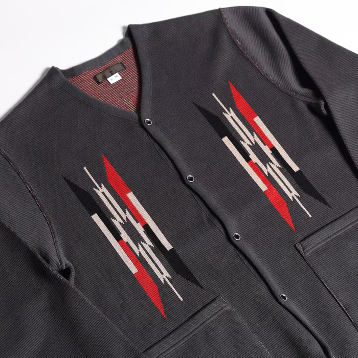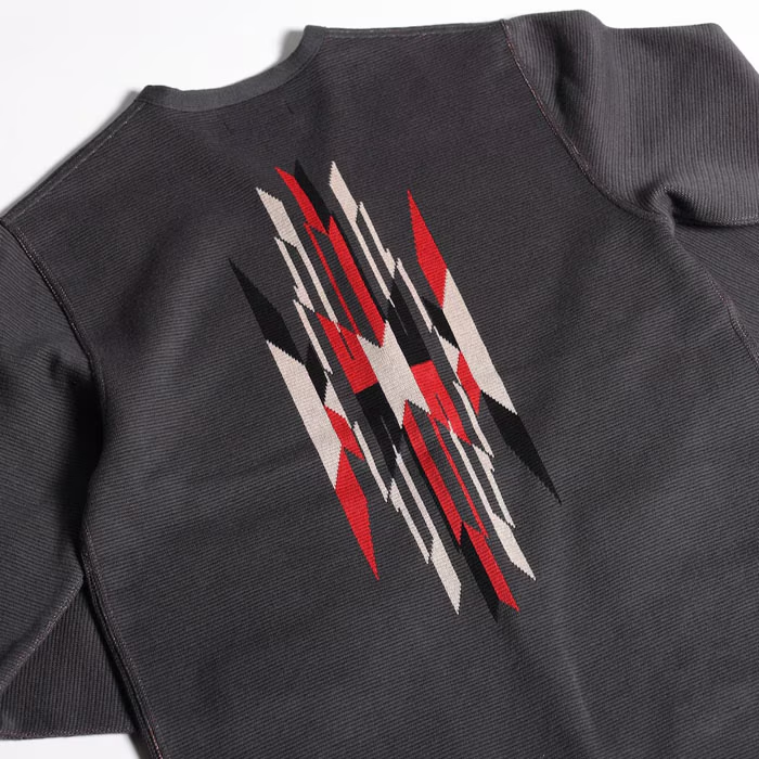 ウエストライドが得意とするネイティブ柄の新デザインは、無地部の横段と共に当時の雰囲気を余すところなく表現した一着。フロントの柄デザインの下にはバランス良く収まる貼り付けポケットを採用。また、各部の裏面も丁寧な処理で仕上げられています。旧いチマヨ織が有する独特の質感を、ウールではなくコットンのダブルジャガードで巧みに表現した一着。良質な素材から丁寧な縫製まで、その全てが新潟産となり、カジュアルながらワンランク上のコーディネイトを楽しむことが可能です。
